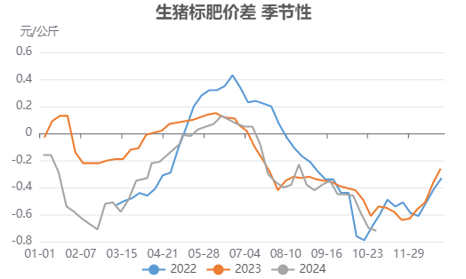 数据看点1:从短期趋势来看,自7月中旬以来,标肥价差呈现负值,即标猪的价格低于肥猪,并在10月上旬绝对值加速扩大,截止44周,已经连续四周扩大,虽然45周环比小幅虽小,但当周相比10月3日数值扩大38%。从季节性来看,随着天气转凉,人们的消费习惯有所变化,腌腊、灌肠需求增加,对肥猪的需求也随即增加,因此8-12月价差处于负值,而且在12月前价差绝对值持续扩大,而在12月份价差有所缩小,这是因为节前养殖端出栏肥猪积极性较高,短期肥猪供应充足。今年标肥价差变化遵循季节性变化规律,目前肥猪需求还未完全释放,未来价差绝对值或将进一步拉大。