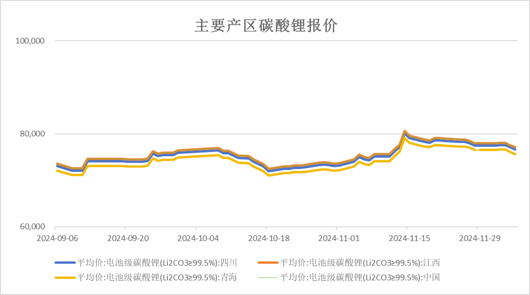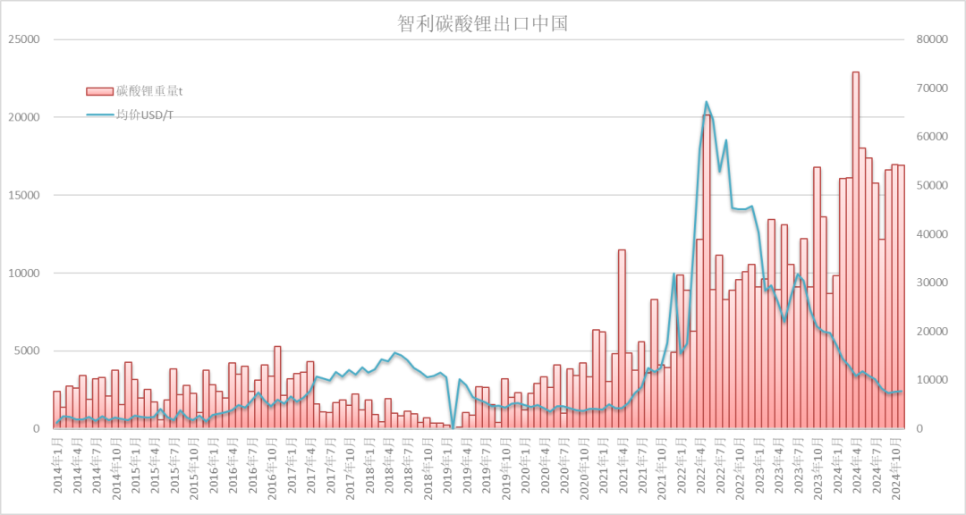 根据智利海关数据,2024年11月出口中国碳酸锂为16936.08吨,环比下降0.002%,同比增长2.46%。出口均价7716.73美元/吨,环比增长1.37%,同比跌价61.4%。我国主要碳酸锂进口方是智利,智利海运时间大约36-47天左右,并且我国碳酸锂进口至下半年来接近85%是来自智利的现货源。据以往数据进口碳酸锂的量级约占国内生产碳酸锂的三成左右,因此,进口碳酸锂对于国内生产的碳酸锂而言起到重要的供应量补充与定价参考作用。