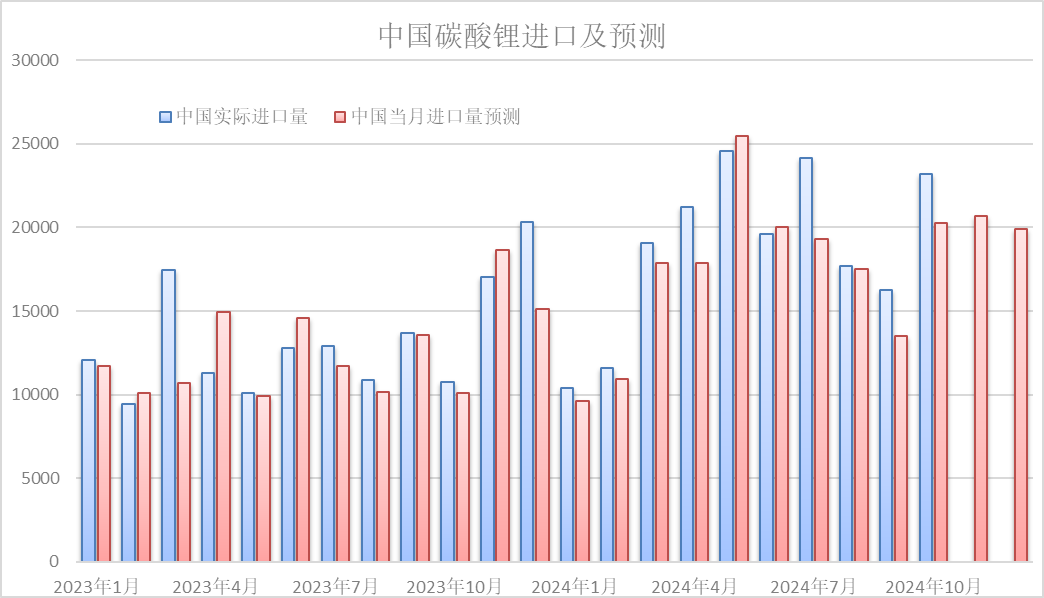 2024年11月从智利出口中国的碳酸锂出现量稳价增的态势,从价格角度来看,国内碳酸锂在11-12月上旬期间国内报价重心逐渐走弱,进口价格预计到港后小幅提振,进口窗口逐渐收敛。从进口量的角度看,由于2024年下半年智利碳酸锂占比有所下降,阿根廷出口快速提升,现占比约接近85%左右,因此到港后预计12月碳酸锂进口量约为2万吨左右。全年我国碳酸锂进口量约为22.8-23万吨之间,较去年增长约45%左右。综上所述,12月过内碳酸锂进口量预计将环比持稳,价格方面由于内外价格的收窄,进口窗口预计将逐渐收敛。碳酸锂基本面目前仍处于供给偏多的阶段,但我们能看到当下锂价不断回落,冶炼厂利润收缩,高成本冶炼厂逐渐控制产能,令供给方面有所控制。需求上,国内政策上不断刺激帮扶新能源汽车产业,令其消费预期不断加强,实际销量逐月抬升。需求整体预期向好,在供给控制的当下,碳酸锂国内库存快速去化。较好的消费预期叠加进口价格方面的支撑,预计12月碳酸锂报价整体下行空间有限,或将逐步止跌企稳。