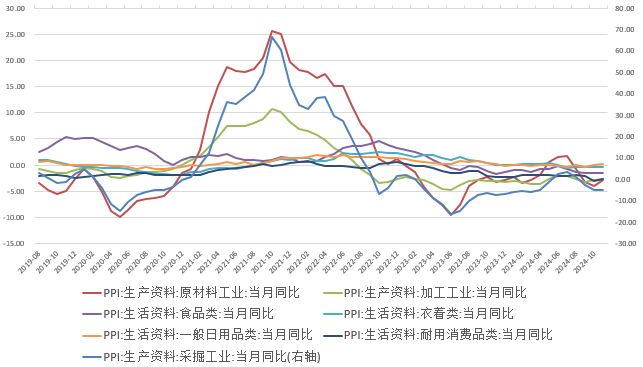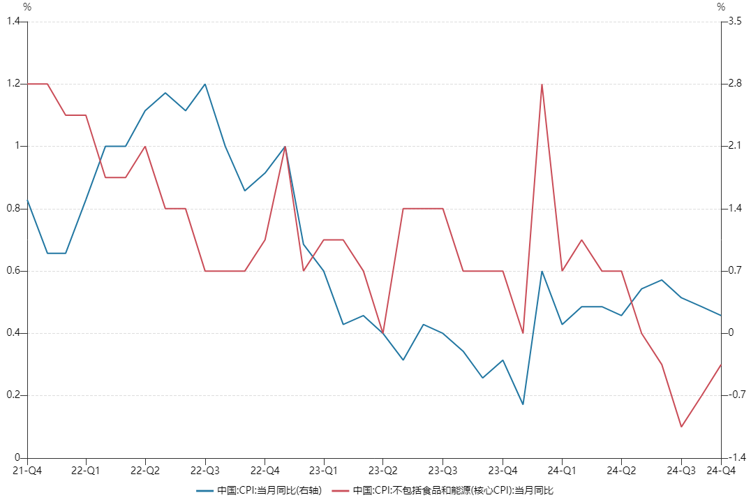 国家统计局12月9日公布的数据显示,11月CPI同比0.2%,预期0.5%,前值0.3;环比下降0.6%。核心CPI继续回升,同比上涨0.3%,涨幅比上月扩大0.1个百分点。PPI同比下降2.5%,预期-2.8%,前值-2.9%,环比上升0.1%。一、食品价格超季节性回落,拖累整体通胀下行。11月份,食品价格同比上涨1.0%,涨幅比上月回落1.9个百分点,低于近十年同期平均水平,是本月CPI下降的主要因素。三季度极端天气出现频率较高,导致鲜菜、鲜果供应偏紧,从而导致价格涨幅连续多月高于季节性。11月我国平均气温为1961年以来历史同期最高,随着天气改善,冷空气过程偏少,短期因素影响褪去,利于鲜活食品生产储运,食品中鲜活食品价格大多超季节性下降,鲜菜、鲜果和水产品价格分别下降13.2%、3.0%和1.3%。生猪四季度供需进入双旺周期,同时天气因素也有所支撑,价格回落3.4%,后市整体供需略偏松,价格或延续下行。后续多数食品供应端或更加充足,但随着春节临近,需求端也将豪装,整体食品项价格同比增速料小幅波动。二、旅游淡季使得文旅价格如期回落。本月非食品价格环比由上月持平转为下降0.1%。其中受国庆假期效应消退等因素影响,飞机票、宾馆住宿和旅游价格分别季节性下降8.6%、7.3%和5.6%。而受国际油价下行影响,本月国内汽油价格也随之回落。核心CPI同比升至0.3%,从侧面反映出拖累主要来自于食品和能源项。内需不足特征明显,政策效果有待加深。后续来看,通胀水平仍受有效需求端制约,回暖动力不足,短期内CPI同比增速料回落。三、国际大宗商品价格影响持续。11月PPI同比降幅收窄0.4个百分点,其中生产资料价格下降2.9%,持平于上月;生活资料价格下降1.4%,降幅收窄0.2个百分点。一系列存量政策和增量政策效果持续显现,房地产、基建项目加快推进,钢材、水泥需求显示恢复迹象,增速止跌回升。受部分非电行业用煤及北方地区供暖用煤需求增加影响,燃气生产和供应业价格持续回升。而生活资料价格下降主要因为国际经济环境偏弱、国内企业促销活动等因素,多数装备制造业价格下降。四季度供暖需求依旧较高,PPI增速料低位波动,但从中长期看,地方化债增量财政政策正式出台,政府料将更多财政资源投入到基建项目中,政策预期料带动相关工业品价格回升。