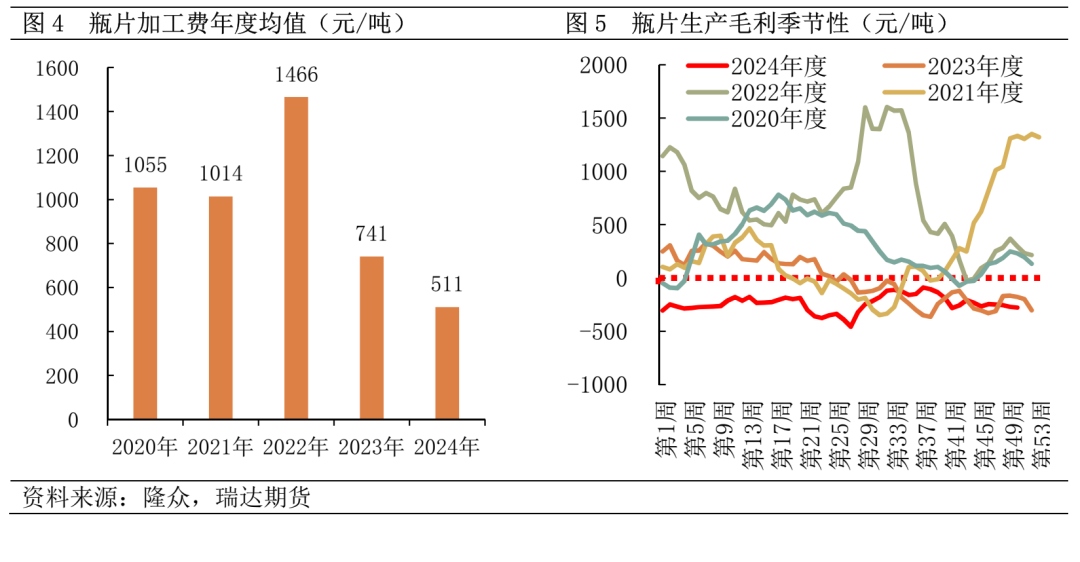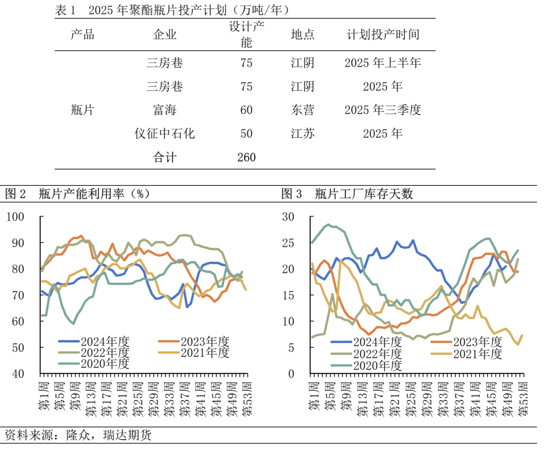 自2023年以来瓶片进入高投产周期,2023年瓶片新增产能400万吨,2024年瓶片新增产能360万吨,产能增速分别达到32.5%和22.1%。截止2024年底,瓶片产能基数预计达到1991万吨水平。瓶片产能新增趋向于现有产能扩张为主,对聚酯瓶片top4企业产能占比统计,前四大瓶片生产商为海南逸盛、华润材料、万凯新材和三房巷,其行业集中度维持在80%水平。2025年瓶片新投计划包括三房巷1、2号装置150万吨,仪征中石化50万吨以及富海60万吨等,累计260万吨,预估2025年瓶片产能增速回落至13.1%,表明本轮瓶片扩产接近尾声。今年以来瓶片呈现累库压力,上半年瓶片工厂库存天数处于20-25天历史高位水平,随着三季度瓶片工厂集体减产,厂内库存快速压缩,进入第四季度需求淡季,库存压力逐步累积。2025年瓶片产能继续扩张,尽管产能增速放缓,但远超过下游需求增速。瓶片下游消费市场中最大的是软饮料市场,而软饮料市场与人口增速、社会消费品零售增速较为一致。在经济放缓以及人口增速不及预期的背景下,瓶片国内消费增速提升空间有限,预计2025年瓶片供需过剩压力难改。受制于近两年产能的高速扩张,瓶片行业利润持续压缩,据统计,2022年瓶片现货加工费在1466元/吨,而2024年均值压缩至511元/吨,波动范围大多时候在300-600元/吨成本线附近,全年最低点在6月份达到300元/吨以下,生产毛利-450元/吨,这也带来了瓶片工厂的集中减产,库存压力减轻叠加出口消纳作用明显,抑制了瓶片加工费的进一步走弱。总体来看,2025年瓶片行业投产扩能增速放缓,仍处于产能扩张期,在持续供应高速增长的背景下,瓶片的开工和加工费面临考验,预计瓶片加工费将维持在300-600元/吨成本线附近运行,关注低加工费对部分落后装置的淘汰作用,随着旧产能逐步出清,出口和内需增长对剩余供应的消纳之后,加工费有望企稳回升。本报告中的信息均来源于公开可获得资料,瑞达期货股份有限公司力求准确可靠,但对这些信息的准确性及完整性不做任何保证,据此投资,责任自负。本报告不构成个人投资建议,客户应考虑本报告中的任何意见或建议是否符合其特定状况。本报告版权仅为我公司所有,未经书面许可,任何机构和个人不得以任何形式翻版、复制和发布。如引用、刊发,需注明出处为瑞达期货股份有限公司研究院,且不得对本报告进行有悖原意的引用、删节和修改。