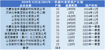 2024年12月,中国预计将迎来一波聚乙烯产能的集中释放,包括内蒙古宝丰、万华化学和山东裕龙在内的多个项目,共计约210万吨的新装置将正式投产。据悉,内蒙古宝丰的55万吨装置已顺利落地,而山东裕龙的新生产线于近期开车。预计到2024年底,中国的PE总产能将达到3596万吨。2025年第一季度,中国约有303万吨的PE装置计划投产,产能仍处于高速增长阶段。伴随着2024年12月投产的装置逐步提高运行负荷,2025年一季度市场供应压力预计将显著上升。尽管部分企业可能会选择推迟投产时间以减轻短期内对市场的冲击,但整体来看新装置的投产仍将在供应端产生重要影响。2024年12月,预计PE装置的检修损失量约为27.08万吨,环比减少40.27%,同比增加31.72%。下旬,中韩石化、福建联合等共约230万吨的停车装置计划重启,尽管有部分石化企业装置短停,但难以抵消重启装置带来的影响,检修损失量环比大幅下降。根据现有检修计划,2025年一季度检修装置较少,涉及产能仅为169万吨。随着前期重启装置的影响逐渐扩大,以及12月停车装置的陆续重启,预计一季度供应端将显著增加。(注:计算时不包括停车时间已超过一年的长期停车装置。)截至12月20日,油制LLDPE的利润为728.52元/吨,煤制LLDPE的利润高达1601.07元/吨,外采乙烯制LLDPE的利润为494.29元/吨,而MTO制LLDPE则亏损353.33元/吨。自10月以来,上游生产企业的密集检修与下游需求的强劲表现,导致LLDPE现货供需偏紧、库存去化显著、价格上扬,各工艺的生产利润显著提升。特别是煤制工艺,由于LLDPE现货价格坚挺而煤炭成本相对较低,利润增长尤为突出,目前在所有生产工艺中理论利润最高。从产能分布来看,油制和煤制工艺占据主导地位,分别占比约60%和20%。煤制、油制工艺利润偏高导致短期装置检修数量相对较少。在国内PE装置快速扩能的背景下,行业利润的压缩成为必然趋势。随着竞争的加剧,亏损装置陆续停车,供应量随之减少,市场有望重新达到供需平衡。然而,从当前的利润水平来看,要实现上游企业的集中停车检修,价格需要有较大幅度的下调。预计2025年一月份新增的临时停产装置数量相对较少,不及二月、三月的水平。(由于各家企业生产工艺以及原料存在较大差异,利润计算仅为理论值,不代表个别企业)根据现有的装置检修计划及前文的推演,我们预测2025年1月,随着检修装置的重启和新产能的逐步释放,中国PE产量将环比和同比上升,预计在242至248万吨之间。进入2月,随着现货市场供需趋于宽松和生产利润的压缩,预计会有更多装置临时停车,导致供应量减少。同时,考虑到2月天数较少,PE产量预计在230至240万吨之间。到了3月,随着下游需求的逐步回暖和天数的增加,产量有望较2月有所增长,预计在240至250万吨之间。2025年一季度,随着新投产装置逐步提升负荷,以及前期停车的装置陆续重启,预计PE供应压力将上升,整体供需关系趋于宽松,现货价格或将承压。具体来看,1月份供需矛盾预计最为显著。随着生产利润逐步压缩,预计2月、3月临停装置数量将增加,供应压力或将得到一定程度缓解,但总体上仍处于供应偏宽状态。