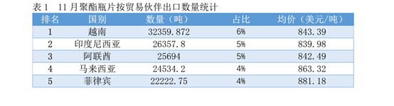 11月瓶片出口至马来西亚有24534.2吨,占比4%,均价在863.32美元/吨,相较越南、印尼和阿联酋的出口均价偏高,如果税率从6.33%上升至37.44%,预计均价将进一步抬升。