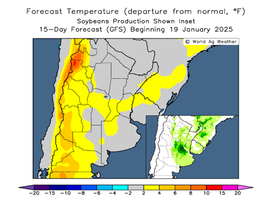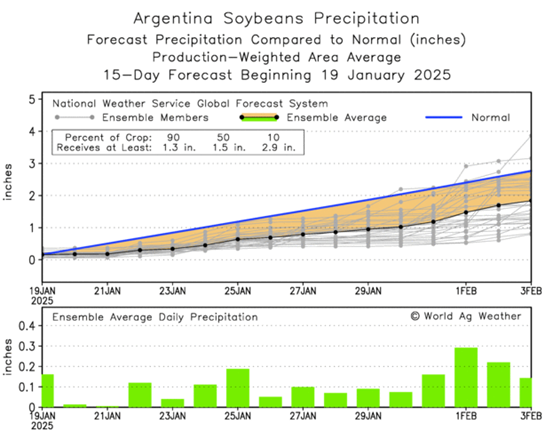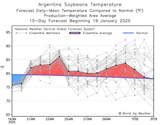 阿根廷是全球重要的谷物生产和出口大国,全国大部分地区土壤肥沃,气候温和,支持大规模谷物种植。根据美国农业部(以下简称USDA)报告显示,2024/25年度五大作物(小麦、大麦、玉米、大豆、高粱)产量约为1.295亿吨,同比增长6.45%。但是近两个月阿根廷炎热干燥,在一定程度上损害农作物,以下重点分析玉米、大豆产量影响情况:阿根廷是全球大豆主产国之一,也是全球头号豆粕和豆油出口国。根据USDA2025年1月报告显示,2024/25年度阿根廷大豆产量预估为5200万吨,同比增加379万吨,幅度7.86%,其产量占全球大豆产量的12.26%;出口预估450万吨,同比减少61万吨,幅度11.94%,其出口量占全球出口的2.47%;大豆压榨副产品——豆粕出口2800万吨,同比增长12.50%,其出口量占全球37%,豆油出口580万吨,同比增长4.88%,其出口量占全球45%。阿根廷大豆产区集中在中部,布宜诺斯艾利斯省(31%)、科尔多瓦省(28%)、圣菲省(19%)、圣地亚哥-德尔埃斯特罗省(9%)。截至1月15日,2024/25年度阿根廷大豆计划种植1840万公顷,种植进度98.2%,上周值97%。阿根廷播种进度正常,已进入收尾阶段。根据布宜诺斯艾利斯谷物交易所数据显示,截至1月15日,大豆作物状况评级良好占比32%,较上周值的49%下降17个百分点,同时低于去年同期值40%;长势正常占比47%,较上周的43%下降4个百分点,同时低于去年同期值51%;长势较差占比21%,较上周增加13个百分点,明显高于去年同期9%。在不利天气影响下,大豆作物状况评级明显下降,说明大豆长势状况变差。根据布宜诺斯艾利斯谷物交易所数据显示,截至1月15日,土壤水分有益到适宜占比60%(上周值77%,去年同期值92%),短缺到极度短缺占比40%(上周值23%,去年同期值8%)。土壤水分有益到适宜占比继续下降,土壤状态恶化。根据USDA2025年1月报告显示,2024/25年度阿根廷玉米产量预估为5100万吨,同比增加100万吨,幅度2%,其产量占全球大豆产量的4.2%;出口预估3600万吨,同比增加200万吨,幅度5.88%,其出口量占全球出口的18.81%。阿根廷玉米种植主要分布在科尔多瓦省(35%)、布宜诺斯艾利斯省(27%)、圣菲省(10%)、圣地亚哥-德尔埃斯特罗省(9%)。根据布宜诺斯艾利斯谷物交易所最新数据显示,截至1月15日,阿根廷玉米播种进度达95.1%,上周值91.6%。玉米播种进度良好。根据布宜诺斯艾利斯谷物交易所最新数据显示,截至1月15日,玉米作物状况评级良好占比39%,较上周的42%减少3个百分点,低于去年同期值46%,正常占比47%,较上周的49%减少2个百分点,低于去年同期值51%,较差占比14%,较上周9%增加5个百分点,高于去年同期值3%。在不利天气影响下,玉米作物状况评级同样下降,说明长势状况变差。根据布宜诺斯艾利斯谷物交易所最新数据显示,截至1月15日,土壤水分有益到适宜占比64%(上周值77%,去年同期值92%),短缺到极度短缺占比36%(上周值23%,去年同期值5%)。玉米的土壤水分有益到适宜比例略高于大豆,但是整体占比同样处于下降过程,明显差于去年同期。从下面未来15天的天气预测图可以看到,阿根廷大豆和玉米产区将在本周末和下周末迎来一定降雨,但是整体降雨量仍然低于正常水平,大部分地区温度高于常值,不利于土壤墒情,同时影响作物生长。