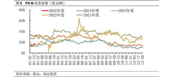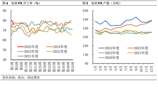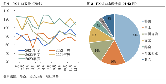 根据海关总署最新数据,2024年12月中国PX进口83.95万吨,较上月减少13.63万吨,跌幅13.97%。2024年1-12月累计进口量为938.13万吨,较去年同期增加28.50万吨,涨幅为3.13%。从PX进口来源分布来看,中国PX主要进口来源为韩国、日本、中国台湾、文莱、越南等东亚、中东国家或地区。2024年12月份PX进口总量83.95万吨,较上月减少13.63万吨,跌幅13.97%,进口前三甲为韩国、日本、中国台湾,分别占PX总进口量的45%、17%和13%。PX全年进口总量为938.13万吨,较去年同期增加28.50万吨,涨幅为3.13%,这也是自2018年后首次实现年度进口规模正增长,由于国内PX装置产能利用率提升,尽管进口总量增长,但PX进口依赖度继续下滑至20%,同比2023年下降1.6个百分点。2024年国内PX无新增投产,2025年仅有一套裕龙装置投产计划,仍存在不确定性,PX国内产能利用率已处于历史最高水平,预计产量进一步提升空间有限。另一方面,下游PTA处于快速投产周期,预计2025年PX供需缺口走扩,进口依赖度有增加趋势。数据看点二:1月PX亚洲装置负荷整体降低,供应预计缩减亚洲地区装置开工负荷是影响我国PX进口的重要因素,2025年1月初亚洲部分装置检修及降负,开工率下滑明显,海外方面印尼两套装置(Pertamina以及TPPI)计划外检修,预计2月初恢复运行,韩国部分装置降负至70%-80%运行。1月PX亚洲装置负荷整体降低,供应预计缩减。数据看点三:PXN价格从低位回升,1-2月亚洲装置开工变动不大