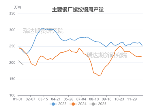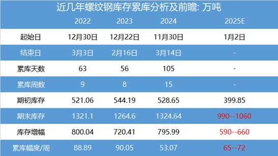 据Mysteel统计,本期螺纹实际产量174.13万吨,环比下降19.16万吨;钢厂库存为136.72万吨,环比增加11.35万吨;社库346.49万吨,环比增45.87万吨;总库483.21万吨,环比增57.22万吨,表需116.91万吨,环比下降68.24万吨。螺纹钢1月2日进入累库周期,期初库存399.85万吨,截至2025年1月23日,螺纹钢连续4周累库,库存较累库期初库存增加20.85%。进入1月,螺纹钢供需延续双降态势,需求由4季度236.27万吨/周下降为190.86万吨/周,降幅19.22%,需求呈现季节性大幅下滑趋势。旧标去库以来,螺纹钢总库存总体维持在低于同期25%的水平,同期,螺纹钢产量维持在18.46%的降幅,螺纹钢需求则维持低于同期15%的降幅。供应下降的幅度大于需求下降的幅度,使得螺纹钢材价格向上的弹性逐渐改善并加强。回顾过去几年螺纹钢材的累库情况,螺纹钢库存累库幅度大致在700-800万吨,2024年因为终端需求不及预期,价格弱势下跌导致库存累库的时间大幅延长。展望节后,我们认为宏观上大的风险对比前期已经弱化很多,产业面,钢厂预计不会给到市场太大的库存压力。我们估算,2025年螺纹钢的库存高点较同期高点下降或者20-25%,库存增幅在590-660万吨水平,库存增幅较同期下降270-330万吨。本报告中的信息均来源于公开可获得资料,瑞达期货股份有限公司力求准确可靠,但对这些信息的准确性及完整性不做任何保证,据此投资,责任自负。本报告不构成个人投资建议,客户应考虑本报告中的任何意见或建议是否符合其特定状况。本报告版权仅为我公司所有,未经书面许可,任何机构和个人不得以任何形式翻版、复制和发布。如引用、刊发,需注明出处为瑞达期货股份有限公司研究院,且不得对本报告进行有悖原意的引用、删节和修改。