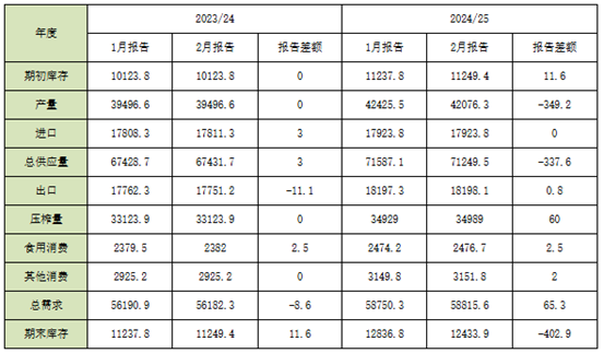 数据:美国农业部发布2月份供需报告显示,本月报告未对美豆单产、产量以及期末库存等数据做出调整,维持上月预估。巴西2024/25年度大豆产量预估1.69亿吨,与上月预估持平;阿根廷2024/25年度大豆产量预估4900万吨,与上月预估5200万吨,下调300万吨;全球2024/25年度大豆产量预估4.2076亿吨,与上月预估4.2426亿吨下调350万吨,期末库存预估1.2434亿吨,与上月预估1.2837亿吨下调403万吨。