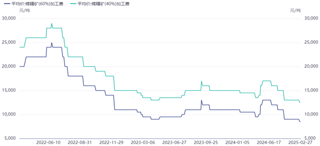 自2024年8月1日起,缅甸曼相矿区停止锡矿生产,做为中国最大的锡矿进口来源国,缅甸地区的停产使的国内原料供应紧张。根据进口统计数据,2024年我国锡矿的总进口量降至15.89万吨,同比下降了36.18%。特别是从缅甸进口的锡矿量,大幅减少至7.64万吨,降幅达到57.67%。受到锡矿供应短缺的强烈冲击,自去年下半年以来,国内锡矿加工费用多次下调,累计降幅达到3500元/吨,目前锡精矿60%加工费8500元/吨,为近三年最低水平,并持续在低位运行。