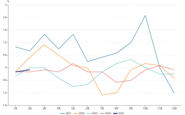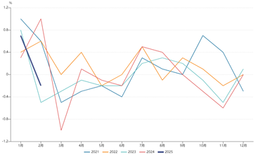 国家统计局3月9日公布的数据显示,2月CPI同比-0.7%,预期-0.5%,前值0.5%;环比下降0.2%。核心CPI继续回升,同比上涨0.3%,仍保持温和上涨趋势,环比上涨0.5%。PPI同比下降2.2%,预期-2.1%,前值-2.3%,环比下降0.1%。海关总署公布数据显示,2025年1-2月以美元计价出口同比2.3%,前值10.7%;进口同比-8.4%,前值1%。