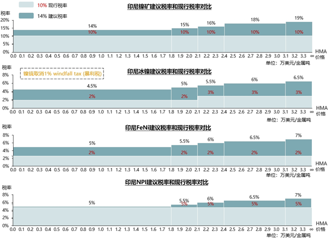 PNBP调整建议, 涉及行业包括镍、煤炭、铜、黄金等。相关镍产品税率从固定值改为按照HMA(金属矿产参考价格)浮动调整。针对镍行业,主要涉及镍矿、FeNi、NPI和镍锍四个产品。从下图可以看出,建议税率呈现两大特征,一是税率整体上调,二是阶梯式上涨。以镍矿为例,当HMA价格超过3.1万美元/金属吨时,税率达到了19%,相较现行的10%税率增加了将近一倍。但结合历史HMA价格走势,该政策落地后的税率执行范围基本在前三个阶梯,即价格在2.4万美元/金属吨以下。