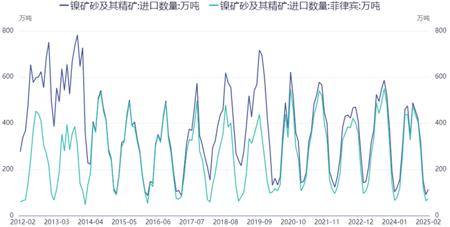 印尼坐拥5500万吨镍储量,但2024年镍铁出口量增长13%,但出口额却反而下降8%,产业链利润分配被进一步侵蚀。事实上,印尼镍矿政策多年来不断更新来改变初级加工陷阱,而中国企业则是见招拆招冷静应对。当印尼2014年首次禁矿时,青山集团等中资企业果断带着RKEF火法冶炼和高压酸浸(HPAL)技术进入苏拉威西岛,这些技术可以让低品位的1.3%红土镍矿也能生产出质量达标、成本较低的镍铁,2024年印尼镍铁产能突破22万吨/月,其中中资控制超七成。此外,中国通过将印尼镍铁加工为电池级硫酸镍,产品附加值提升300%以上。这种产业链延伸能力,使得即便印尼实施出口配额削减(2025年计划从2.7亿吨降至1.5亿吨),中资企业仍可通过调节库存和工艺升级化解冲击。2024年中国从菲律宾镍矿进口量已占总量的90%,由于菲律宾基础设施和生产技术落后,使得中国买家可以从容切换菲律宾镍矿,缓解印尼限矿的压力。