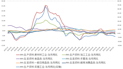 3月份,食品价格同比由上月下降3.3%缩窄至1.4%,主要是气温偏高和节后需求弱的影响,但降幅缩窄反映居民消费正处于改善阶段。具体来看,部分鲜活食品大量上市,鲜菜、猪肉和鲜果价格分别下降5.1%、4.4%和1.6%;节后生猪养殖端陆续复工恢复出栏,后市整体供需略偏松,食品价格或延续小幅回落。