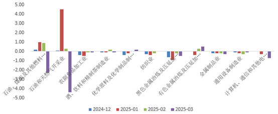 3月我国PPI同比下降2.5%,前值-2.2%;环比由-0.1%扩大至0.4%,同比环比均有所回落,主要受黑色建材和石油化工拖累。其中生产资料价格同比下降2.8%,生活资料价格下降1.5%,剪刀差与上月持平。关税战愈演愈烈,特朗普言论不断加剧全球经济衰退担忧,对国际大宗商品价格形成压制,而原油和出口相关行业表现最为明显,3月石油和天然气开采业价格下降4.4%,精炼石油产品制造价格下降1.7%,有机化学原料制造价格下降0.2%。除此之外,煤炭库存偏高,需求季节性回落也产生了一定拖累。而4月以来,原油期货跌幅已达两位数,或将继续拖累我国二季度PPI。但与此同时,贸易战升级必将加速我国国产商品替代进程,推动“新三样”产品制造,强化我国高端制造业突破,更好地发展“新质生产力”。然而,高端制造业技术突破无法一蹴而就,在短期内或有所承压,后续需持续关注关税及相关产业政策。