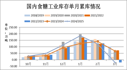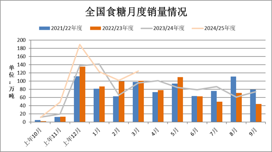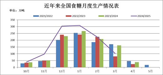 截至2025年3月底,2024/25年制糖期(以下简称“本制糖期”)云南有43家、广西有1家尚在生产,其他省(区)糖厂均已全部停机。本制糖期全国共生产食糖1074.79万吨,同比增加117.48万吨,增幅12.27%。全国累计销售食糖599.58万吨,同比增加126.1万吨,增幅26.64%;累计销糖率55.79%,同比加快6.33个百分点。其中3月份单月产糖103.18万吨,同比减少59.34万吨:单月销糖124.42万吨,同比增加28.82万吨;工业库存475.21万吨,同比减少8.65万吨。