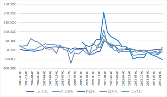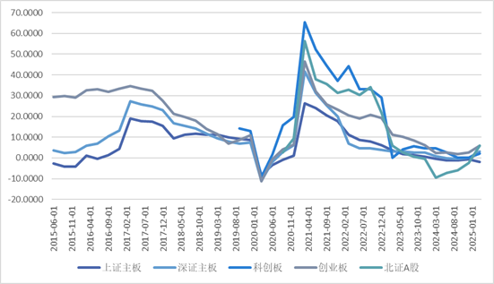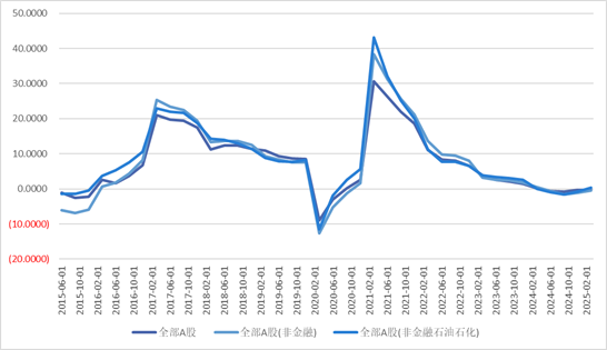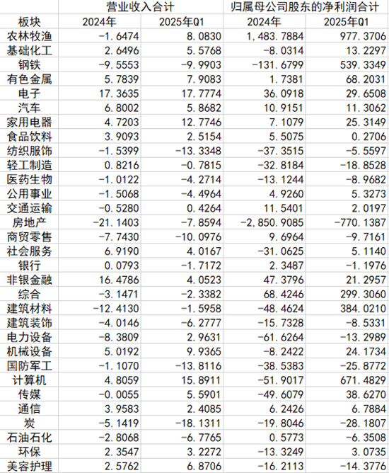 截至5月14日,A股累计共有5403家公司披露2024年年报,共有5402家公司披露2025年一季报,披露率分别为99.85%、99.83%。2024年全部A股业绩同比小幅走弱,营收增速与净利润增速分化明显,营收同比降幅略微收窄,净利润同比降幅大幅走阔;2025年一季度全部A股业绩呈现“营收走弱,利润改善”态势,2025年一季度A股全体上市公司营收同比降幅较2024年微幅走弱,净利润同比则由负转正。依上市板划分,深交所主板及创业板2025年一季度利润明显好转,科创板及北交所公司则延续下滑。2024年及2025年一季度,全体A股上市公司净资产收益率仍位于周期底部,企业杠杆率及净利率虽有所提升,但营收承压使得总资产周转率偏低,整体ROE上行压力依旧存在。收入端,2024年全体A股、全A非金融以及全A非金融两油营业收入合计同比增长-0.24%/-1.04%/-0.79%,四季度单季同比增长1.31%/0.54%/1.13%;利润端,全体A股、全A非金融以及全A非金融两油归母净利润合计同比增长-2.97%/-13.05%/-13.87%,四季度单季同比增长-15.11%/-47.63%/-52.5%。2025年一季度全体A股、全A非金融以及全A非金融两油营业收入合计同比增长-0.32%/-0.41%/0.41%,归母净利润合计同比增长3.66%/4.51%/5.52%。不论是从累计或是单季度净利的同比增速来看,2024年全年/四季度A股上市公司获利状况仍旧不佳,但随着此前大量稳增长政策的效果开始显现,上市公司2025年一季度盈利情况随着宏观经济数据一同好转。二季度,在关税冲击下,国内已有更多的稳增长、扩内需政策出台,5月7日央行宣布降准降息,金融监管总局和证监会也表示将对受关税冲击较大的企业进行帮扶。后续,随着财政政策的跟进,A股整体盈利有望与宏观基本面形成共振。2024年上证主板/深证主板/科创板/创业板/北证A股的营业收入合计同比增长分别为-0.63%/0.21%/0.11%/2.65%/-2.55%;归母净利润合计同比增长分别为1.9%/-22.67%/-40.41%/-12.93%/-24.01%。2025年一季度上证主板/深证主板/科创板/创业板/北证A股的营业收入合计同比增长分别为-1.99%/3.15%/2.16%/5.97%/5.8%;归母净利润合计同比增长分别为2.24%/12.99%/-52.3%/15.43%/-7.65%。从收入端来看,除上证主板营收降幅略有扩大外,其余板块2025年一季度营收均较2024年明显好转,由于上证主板整体权重较大因此在一定程度上拖累全A营收增速。从利润端看,各上市板表现不尽相同,上证主板归母净利增速小幅提升;深证主板及创业板指增速由负转正;科创板降幅进一步走阔;北证A股降幅收窄。科创板方面,虽然在今年的人工智能浪潮下,科创50指数2月份有较为亮眼的表现,但受到美国相关产业政策打压,再加上科创板中初创公司占比较大,在外部环境不稳定的情况下,更易遭受负面冲击,因此获利表现不尽人意。然而,近一段时间以来,监管层面持续出台相关扶持政策,5月7日,央行宣布创设科技创新债券风险分担工具,为科技创新企业和股权投资机构发行低成本、长期限的科创债券融资提供支持。证监会也表示近期将出台改革措施,在市场层次、审核机制、投资者保护等方面进一步增强制度包容性、适应性。结合2024年发布的“科创八条”等一系列鼓励并购重组的政策措施,科创企业有望迎来通过并购重组实现资源整合和优势互补的黄金机遇,未来板块业绩修复值得期待。数据看点3:大盘蓝筹盈利走弱,中小盘股获利由负转正2024年全年,营业收入方面,上证50、沪深300、中证500和中证1000同比增长1.16%/0.97%/-1.35%/-1.75%;净利润方面,上证50、沪深300、中证500和中证1000同比增长3.25%/6.67%/-13.54%/-18.33%。2025年一季度,收入端,上证50、沪深300、中证500和中证1000同比增-0.45%/-2.48%/-1.76%/2.54%;利润端,上证50、沪深300、中证500和中证1000同比增长2.96%/0.9%/7.41%/6.36%。整体来看,大小盘业绩表现分化,2024年,上证50、沪深300净利同比增速加快,但在2025年一季度回落;中证500、中证1000,2024年全年净利降幅较前值扩大,但随着一系列政策组合拳发挥作用,2025年一季度增速由负转正。从行业净利润来看,2025年一季度食品饮料、银行、非银金融归母净利增速均较2024年下滑,由于食品饮料、银行、非银金融股在上证50及沪深300指数中占有较大权重(合计分别占49.5%和33.7%),从而在一定程度上拖累上证50、沪深300净利增速下滑;虽然中证500及中证1000指数中权重最大的电子行业(分别占12.3%和15.3%)2025年一季度净利增速有所下滑,但医药生物、电力设备、计算机这三个行业(合计分别占25.5%和26.7%)净利的明显好转抵消了电子股的负面影响,并在较大程度上带动中证500及中证1000归母净利润同比增速转正。2024年全体A股、全A非金融以及全A非金融两油净资产收益率分别为7.92%/6.71%/6.53%;2025年一季度全体A股、全A非金融以及全A非金融两油净资产收益率分别为7.73%/6.63%/6.48%。从杜邦三因子拆分来看,2024年四季度受到销售净利率下滑影响,全体A股ROE较三季度下滑。而2025年一季度虽然上市公司净利率及杠杆率回升,但受到营收回落影响,总资产周转率下滑超80%,拖累ROE进一步下行。本报告中的信息均来源于公开可获得资料,瑞达期货股份有限公司力求准确可靠,但对这些信息的准确性及完整性不做任何保证,据此投资,责任自负。本报告不构成个人投资建议,客户应考虑本报告中的任何意见或建议是否符合其特定状况。本报告版权仅为我公司所有,未经书面许可,任何机构和个人不得以任何形式翻版、复制和发布。如引用、刊发,需注明出处为瑞达期