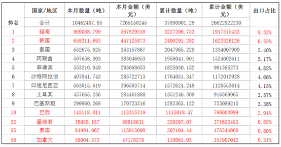 2024年中国出口钢材总量1.11亿吨,出口至美国的钢材总量89.17万吨,仅占中国全年钢材出口总量的0.8%,占比较低。主要出口国分别为:越南1276万吨,占比11.5%;韩国819万吨,占比7.4%;阿联酋550万吨,占比4.95%;泰国511万吨,占比4.6%;菲律宾504万吨,占比4.55%;印尼484万吨,占比4.3%。