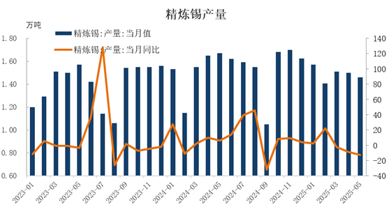 根据SMM数据,2025年05月,我国精炼锡的产量约1.46万吨,较前一月出现了2.37%的环比下降,而从同比数据来看下降了11.24%。因锡精矿及废锡供应链持续紧缩对产能形成刚性约束,整体开工率小幅下滑。预计6月精炼锡产量约1.4万吨,环比下降4.58%,同比下降13.6%,因部分云南和江西的冶炼企业计划停产检修。