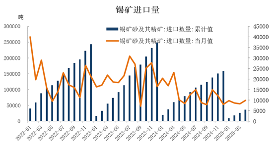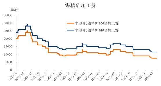 海关总署数据显示,2025年4月国内锡矿进口量为0.98万吨(折合约4336金属吨)环比18.48%,同比下降4.22%。1-4月累计进口量为36.7万吨,累计同比下降47.98%。从加工费来看,目前40%锡精矿加工费11500元/吨,60%锡精矿加工费7500元/吨,加工费降至低位。