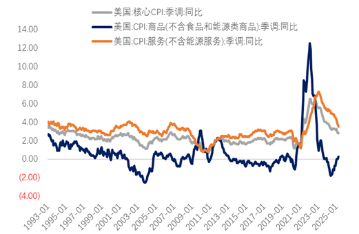 细分项来看,核心通胀疲软是整体CPI数据不及预期的主要驱动。剔除食品能源后,5月核心CPI仅微升0.13%,同比增速连续第三个月持平于2.8%。本应直接受关税冲击的核心商品价格意外环比下降0.04%,其中新车(环比-0.3%)与二手车(环比-0.5%)的价格下跌为主要拖累项,或与此前汽车经销商的“抢进口”和囤货行为有关,在库存持续的消耗下,后续汽车价格仍存在上行风险。本次关税压力更多体现在医疗护理商品(环比+0.6%)、休闲商品(环比+0.4%)及教育通信产品(环比+0.1%)等细分领域,这些品类价格涨幅持续高于过去一年趋势水平。剔除汽车后,其他核心商品价格环比上涨0.2%,推动该类别同比增速提升0.2个百分点至0.3%。整体来看,核心商品CPI呈温和上行态势,当前数据可能仅反映了部分关税影响,关税的实际通胀效应或于数月后逐步显现。