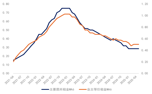 与此同时,服务通胀分项持续释放缓和信号。5月核心服务价格环比上涨0.2%,低于其6个月与12个月均值。主要居住成本涨幅回落至0.3%,反映主要居所租金(环比+0.2%,前值+0.3%)与业主等价租金(环比+0.3%,前值+0.4%)双双走软。机票价格连续第四个月下跌(环比-2.7%),叠加外宿价格(环比-0.1%)录得连续三个月下降,显示旅游消费需求正在收缩,休闲服务(环比-0.1%)亦连续两个月录得下滑。可选服务通胀的缓和趋势表明企业定价能力有所减弱,预示未来数月服务通胀可能持续降温。核心服务中占比最高的住房通胀项亦持续放缓,主要居所租金和业主等价租金的6个月移动平均值均持续回落,住房价格虽仍高于疫情前的水平,但较去年同期水平已明显回落。随着住房通胀的进一步缓和以及劳动力成本增速放缓,预计受关税影响相对有限的核心服务通胀或延续放缓趋势。