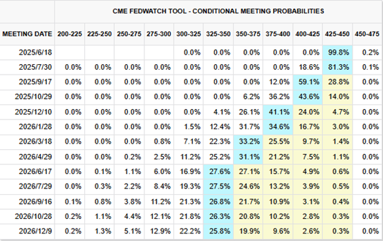 在关税不确定性持续扰动的背景下,5月美国CPI增速意外低于预期,环比增长仅录得0.1%,CPI同比增速从2.3%微升至2.4%,但这一变化主要源于四舍五入效应,5月实际同比增速为2.35%。当月汽油价格下跌2.6%,有效抑制了整体通胀上行。食品价格环比上涨0.3%(4月为下降0.1%),但同比涨幅2.9%显示基本趋势未变。名义工资3.5%-4.0%的增速与2.25%-2.50%的通胀水平,继续支撑实际收入保持约1.5%的稳健增长态势。未来的通胀水平或仍在工资-通胀螺旋以及关税滞后效应下存在一定的上行风险。总体来看,通胀水平呈温和放缓态势,叠加此前稳健的非农就业报告,将进一步缓解市场对于美国经济“滞胀”风险的担忧,美联储降息预期则得到相应提振。