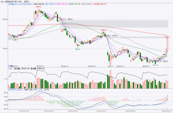 中东局势升温,伊以冲突加剧。据央视新闻最新报道,当地时间12日凌晨(北京时间13日早间),以色列对伊朗发动袭击。以色列总理内塔尼亚胡表示,以方针对伊朗主要从事核武器研发的顶尖科学家进行了打击;以色列军方官员表示,已完成第一阶段行动,包括对伊朗数十个军事目标的打击,其中还包括伊朗不同地区的核目标,预计在不久的将来会有针对以色列及其平民的导弹和无人机袭击。截至发稿时,以色列突袭伊朗核设施,暂无核泄漏,但伊朗核科学家费雷敦·阿巴斯和穆罕默德·迈赫迪·德黑兰在以色列袭击中丧生,伊朗革命卫队司令萨拉米在以色列袭击中丧生。 伊朗安全部门消息人士透露,伊朗计划对以色列袭击“作出严厉回应”。事件点燃市场情绪,截至6月13日15时,国内原油2507合约大幅攀升,涨幅高达6.90%。