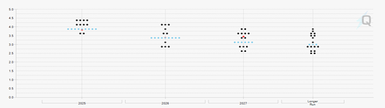 3月发布的点阵图显示,FOMC票委对2025年底利率预期的中值为降息50基点,到2026年底累计降息100个基点。最新公布的点阵图显示,2025年底的利率预期中值维持不变,仍意味着从当前4.25%-4.50%的目标区间降息50个基点。然而,FOMC对今年货币政策前景仍存在明显分歧。目前有10位成员认为到2025年底降息50或75个基点是合适的,2位FOMC委员认为今年仅需降息25个基点,另有7位成员主张全年维持利率不变,而在3月时仅有4位委员认为今年不应降息,预示关税阴影笼罩下经济前景仍不明朗,后续通胀和失业率数据或仍存在波动。此外,2026年底的利率预期中值从3月预测的累计降息100个基点下调至75个基点,在经济韧性尚存的背景下,美联储对未来降息路径维持较为谨慎的立场。