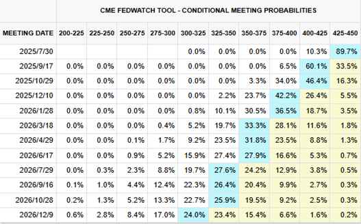 点阵图和鲍威尔的表态表明,政策前景仍高度不确定,这种不确定性在很大程度上源于特朗普关税政策的不可预测性。从传导机制来看,加征关税措施可能通过抑制贸易活动对实际GDP增长产生负面影响,同时推升进口商品价格进而加剧通胀压力,这一效应或导致FOMC维持现行利率水平甚至转向紧缩政策。FOMC更可能将关税引发的短期价格波动视为暂时性因素,而将政策重心放在评估关税对经济增长动能和劳动力市场的实际影响。当前市场定价反映的基准情景是FOMC或在9月货币政策会议上开启宽松周期,并在年底前实现累计75个基点的降息幅度。然而需要指出的是,若未来数据显示通胀预期持续升温或薪资增长出现加速迹象,不排除FOMC推迟宽松时点的可能性。鲍威尔主席在新闻发布会上的表态也印证了这一点,其特别强调政策制定者"预计将于未来数月获取更多关于关税政策实际影响的评估数据"。后续经济数据的演变,尤其是关税政策对供需两侧的实际冲击程度,将成为决定货币政策路径的关键变量。