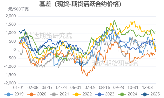 鸡蛋作为生鲜品,对存储的温度、湿度要求严格,即使在冷库条件下也很难保持长时间存储,所以在供应充裕的情况下,通常会通过降价等途径销售。另外,鸡蛋季节性需求特别明显,节假日对其需求的拉动较为明显。故而,蛋价也呈现较为规律的季节性趋势。一般而言,五一、端午节日过后,进入梅雨季节,叠加大量生蔬上市,鸡蛋消费会进入季节性消费淡季,蛋价也会相应出现低点。不过,现阶段低点通常比上半年年后低位略高。而后市场一般会对中秋和国庆节需求给予较强预期,故而蛋价一般经历短暂盘整后即开始季节性上涨,一般在9月达到全年最高点。期货盘面而言,现阶段主力合约为2508合约,对应的是8月时期蛋价,而此阶段因节日备货提振,蛋价处于季节性上涨阶段,故而盘面价格普遍会高于当前现货市场,基差基本也会处于负值区域。
