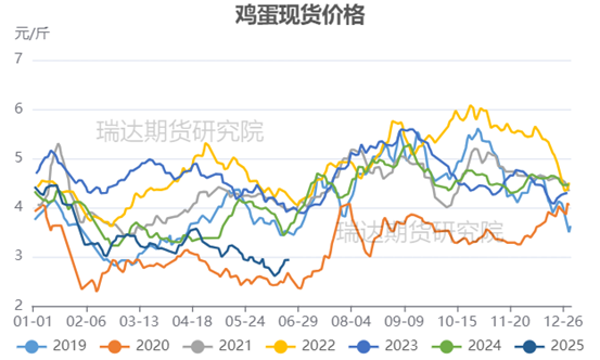 今年而言,近半个月来基差来到同期偏低的水平。主要是一方面,现货端由于产能的持续回升,供应压力不断增加,使得五一、端午节日提振力度较为有限,且6月蛋价低点低于2、3月时期的低位。6月24日,现货市场平均价报2931元/500千克,处于近年来次低位;另一方面,从前期补栏情况和养殖周期推断,三季度,新增开产量高于可淘汰量,蛋鸡存栏仍处于增加的趋势中,进而使得盘面估值也来到相对低位,所以在现货价格进一步回落的情况下,期价跌势不及现货市场。另外,由于前期养殖端持续亏损,且近期亏损幅度有进一步提升倾向,推动老鸡淘汰进程有所加快,降低产能增幅,从而也提升需求旺季到来时蛋价的涨幅,利好期货市场。