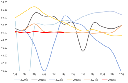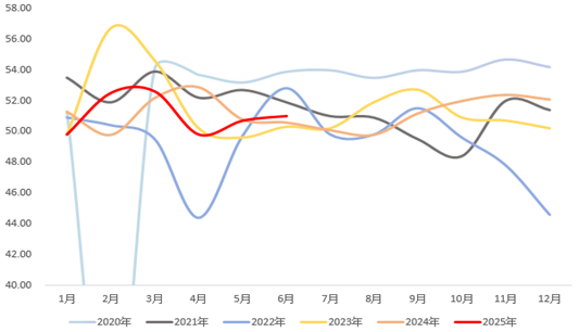 6月30日,国家统计局公布数据,6月官方制造业PMI录得49.7,前值49.5,预期49.7;非制造业PMI50.5,前值50.3,预期50.3;综合PMI录得50.7,前值50.4。其中,服务业PMI录得50.1,建筑业PMI录得52.8,均位于扩张区间。