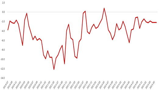 6月原材料价格指数和出厂价格均上升1.5,成本压力未改变。原材料购进价格指数与出厂价格指数的差值已扩大至2.2,较一季度水平进一步走高,上下游利润分化,导致下游企业承压显著。产成品库存指数也位于收缩区间,去库进程持续推进。