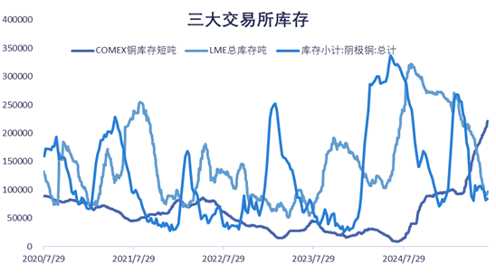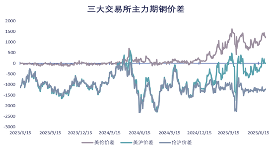 从整体趋势上来看,美铜于2025年上半年一直保持对伦铜的强势地位,由于美国232调查(232调查指美国商务部根据1962年《贸易扩展法》第232条款规定的授权,对特定产品进口是否对美国国家安全造成威胁进行立案调查,该调查允许美国总统限制被认为对国家安全构成威胁的产品进口)的存在。2025年2月25日,特朗普政府对铜发起的232调查,若该调查结束后,极有可能导致美国政府对铜进行大额关税加征,故市场在调查期间美当地铜贸易商及产业链相关公司对铜进行大量的储备和采购导致美铜大幅涨价,CME对LME铜溢价明显,国际铜贸易流向出现变化。全球三大交易所铜库存能观测到,LME大量流出而CME库存加速累积,相较于海外来说,国内沪铜库存大体保持着以往季节性变化,受影响较小。