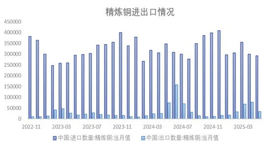 从进出口角度分析,由于期货价格对现货定价有一定指导和参考的作用,在2025年2-4月期间,美沪价差峰值达到500美元/吨左右,并且持续保持正值时间较久,在此期间,国内精炼铜出口亦出现明显增量局面。从近期铜价走势来看,6月下旬至7月初,美铜再现凌厉上行走势,在此期间,美沪价差再度重返溢价区间,但由于本次溢价区间持续时间尚短,故本次对国内出口铜方面的增量将有限。