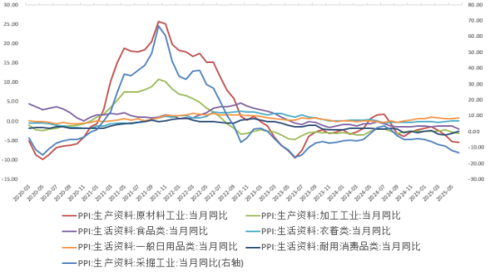 6月我国PPI同比下降3.6%,预期-3.2%,前值-3.3%;环比维持-0.4%不变,供需失衡是核心因素。具体来看,夏季高温雨水天气增多,影响部分房地产、基建项目施工进度,叠加钢材、水泥等供给相对充足,相关原材料价格下行显著;此外,绿电对火电的替代作用增强,电煤需求减少,加之煤炭生产保持稳定,电厂、港口存煤充足,煤炭加工价格下降5.5%,煤炭开采和洗选业价格下降3.4%。本月生产资料价格同比下降4.4%,生活资料价格下降1.4%,剪刀差走阔,上下游材料价格分化严重,下游企业盈利能力持续减弱,承压明显,与PMI小型企业景气度维持一致。