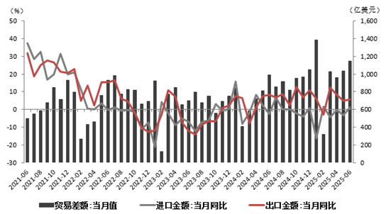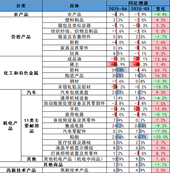 按美元计价,6月我国出口同比增长5.8%,较上月回升1个百分点;对美出口同比从5月的-35%进一步回升至-16%,降幅收窄或体现出关税局势好转后对美贸易活动的改善。但从增速来看,我国贸易仍维持较好韧性,除开基数原因,或与关税豁免截止日期(7月9日)接近所导致的“抢出口”有关。6月我国对欧盟出口同比增速回落4.4个百分点至7.6%,主要受基数影响;对东盟出口同比从14.8%回升至16.8%,始终为我国第一大贸易伙伴。分产品来看,受关税影响较大的劳动密集型产品出口增速和机电产品均有好转。6月机电产品、劳动密集型产品出口同比分别为8.2%(5.5%)、0%(-2.5%),新质生产力为核心。此外,6月份我国制造业PMI为49.7,比上月上升0.2,新出口订单指数和进口指数分别为47.7和47.8,比上月上升2.8和3.7个百分点,至美国订舱量、运价均有回升,叠加“稳外贸”政策加码加力,或反映下半年贸易端持续修复。