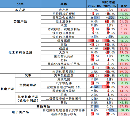 6月我国进口同比增速为1.1%,增速较5月回升4.5个百分点,由负转正且改善显著,同样受关税好转拉动。我国自美进口同比从上月-18.1%进一步回升至-15.5%,对整体进口的拖累有所改善。从产品来看,上游能源和工业金属原材料进口均有所改善,同比分别较上月回升8.5、/3.2个百分点至-15.9%和-2.6%;中下游产品进口则整体维持韧性,机电产品进口从5.5%上行至6%。但就价格来看,大宗商品价格低迷仍有拖累,“量涨价跌”特征明显,同时7、8月份是欧洲、日本、越南等国家与美国重新谈判的窗口期,贸易战不确定性尚存,三季度进口增速料承压。