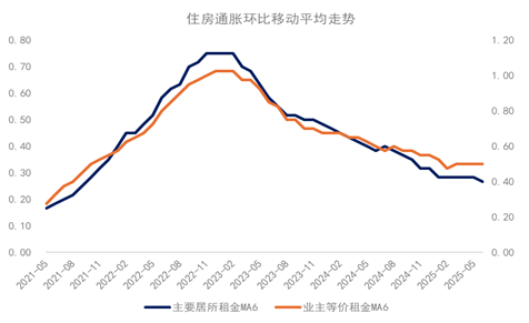 核心服务分项延续温和放缓态势,六月增速录得0.25%,略低于过去六个月均值(+0.27%)。分项数据显示通胀结构分化加剧:旅行服务价格连续第五个月下行,其中酒店房价骤降2.9%,机票价格微跌0.1%。此类分项的持续走弱反映出可选消费收缩与服务提供商定价能力的持续弱化。另一方面,必需服务通胀走强显现韧性:医疗服务价格上涨0.5%,主要居住成本通胀微升0.2%,同比涨幅持稳于3.80%。主要居所租金和业主等价租金同比MA6指标(六个月移动平均值)持续下行,住房通胀延续放缓趋势,但私营部门租金指标显示居住成本月率已接近企稳,预示未来数月该类别进一步通缩空间有限。