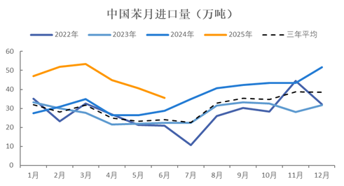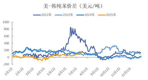 不过与往年同期相比,6月中国苯进口量仍处于同期高位,这主要是由美国纯苯进口减量所致。一方面,1至6月美国纯苯供需偏弱,且二季度芳烃调油行情未能如期启动,美韩纯苯价差低于往年同期水平,导致美国进口套利窗口基本处于关闭状态。另一方面,二季度特朗普关税政策落地,美韩纯苯贸易流受阻,部分原计划流向美国的韩国纯苯资源外卖至中国,导致中国苯进口量高于往年。据TradeMap数据,2025年1至5月,美国苯累计进口40.72万吨,累计同比-55.29%;其中从韩国累计进口苯6.07万吨,累计同比-86.72%。
