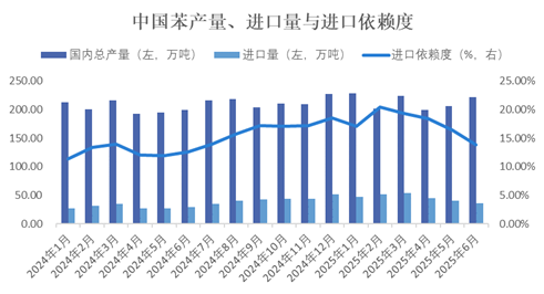 据中国海关总署统计,2025年6月中国苯进口量为35.46万吨,环比-12.59%,同比+23.57%,进口依赖度环比下降2.64个百分点至13.78%。1至6月,中国苯累计进口273.06万吨,累计同比+56.19%。