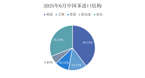 结构上看,2025年6月中国从韩国进口苯14.08万吨,较上月减少7.93万吨,环比-36.04%。6月中国纯苯进口中,韩国占比39.71%,较上月下降14.56个百分点。6月从印度、荷兰、泰国等国家、地区进口纯苯数量有所增长,从沙特阿拉伯、日本、印度尼西亚等国家进口纯苯数量小幅下降。总体上,我国纯苯仍维持韩国进口为主、东南亚及南亚进口为补充的特征没有变。