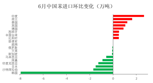 6月受国内纯苯供应增量、下游需求变化有限影响,苯进口量、进口依赖度出现较大幅度下降。由于今年美国从韩国进口纯苯减少、韩国纯苯外卖至中国高于往年,上半年中国苯进口量始终处于同期高位。结构上看,6月中国从韩国进口减量是苯进口量下降的主要原因。虽然6月韩国进口占比有所下降,但我国纯苯以韩国进口为主、东南亚及南亚进口为补充的特征没有变。