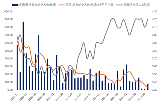 2. 劳动力市场需求边际走弱,薪资增速呈温和放缓态势,一定程度上或缓解薪资-物价螺旋效应所驱动的通胀上行风险。在关税的影响下,未来通胀走势不确定性仍较强,但薪资增速降温降低了通胀大幅上行的可能性,为联储在降息决策上提供更多空间和弹性。