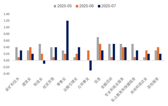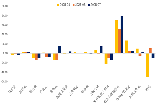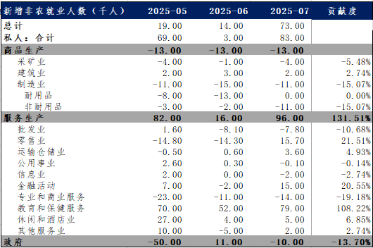 7月非农报告所体现的降温趋势具备一定的广泛性,即就业新增放缓走势于各行业分项中均得以体现。联邦政府维持招聘冻结政策,7月政府部门就业减少1万人,其中联邦政府就业骤减1.2万(州政府+0.5万,地方政府-0.3万),使联邦政府就业较今年1月峰值累计减少了8.4万人。私营部门虽新增8.3万就业(略低于市场预期的+10万),但增量高度集中于医疗保健(+5.5万)和社会援助(+1.8万)领域,主因这些领域长期面临供应短缺但需求坚挺。制造业就业继6月小幅下降后,7月进一步减少了1.1万人,降幅远大于预期。批发贸易就业同样下滑0.8万人(连续第三个月下降),零售业持平略降。专业和商业服务业就业继6月下修后,7月再减1.4万,信息行业微降0.2万,白领岗位需求持续疲软。除医疗和教育相关行业维持坚挺外,其余多数产业均显现一定程度的疲软态势。此前公布的PPI数据显示美国国内最终需求增速在第二季度降至两年半来最低水平,商品消费疲软叠加贸易不确定性,使许多依赖市场景气的行业招聘意愿受到抑制,关税较基准水平大幅抬升的背景下,生产者或不得不采取将成本上升压力转嫁至消费端。最新公布的7月ISM PMI数据亦表现平平,高关税及高利率环境或已对经济构成一定的负面冲击。