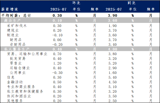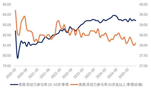 6月CPI数据显示核心商品物价受关税等成本冲击有所反弹,但美国薪资增速保持温和。7月平均时薪环比上涨0.3%,同比增速小幅升至3.9%,基本符合近期就业成本指数(ECI)的走势。薪资增速已明显低于一年前4.5%以上的水平,呈现出“逐步放缓并趋于平稳”的特征。这一增速与当前约2%的劳动生产率增长之和大体相当,也就是说,目前的工资涨幅与2%通胀目标相匹配。美联储主席鲍威尔在7月FOMC记者会上就指出,工资增长继续温和放缓,虽然名义涨幅仍略高于通胀,但整体劳动力市场趋于再平衡。最新平均每小时工资水平为36.44美元,同比涨幅3.9%,并未出现薪资-物价螺旋上行的迹象。考虑到就业市场供需两端的降温,当前美国劳动力市场的薪资趋势尚未对通胀构成显著压力。相反,就业增长放缓和薪资温和增长的组合,反映出劳动力市场或较为温和地降温,这也为美联储在利率政策层面提供了一定空间和弹性。
