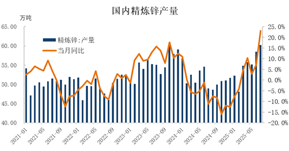 2025年7月SMM中国精炼锌产量60.21万吨,环比增加3%,同比增加23%左右,1-7月累计同比增加4%以上,高于预期值。预计2025年8月国内精炼锌产量62万吨,环比增加将近3%,同比增加27%以上,预计2025年1-8月产量累计同比增加7%以上。