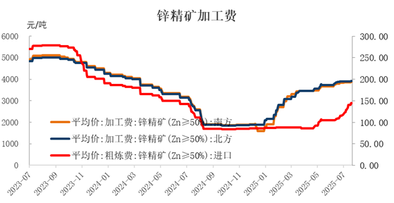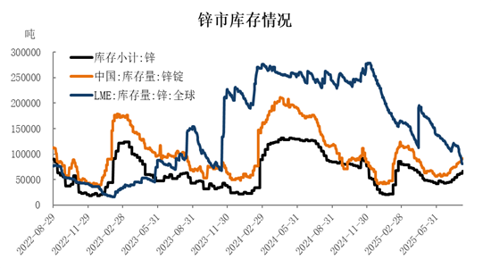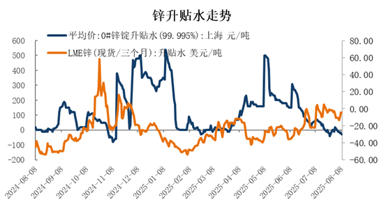 库存方面,截至2025年8月8日,LME精炼锌库存为81500吨,月度减少27000吨;上期所精炼锌库存为65917吨,月度增加20553吨;国内精炼锌社会库存为91200吨,月度增加21400吨。7月以来LME库存继续下降,现货升水维持偏高水平;国内库存则有明显回升,因锌价上涨,下游消费淡季,市场采购意愿寡淡,现货升水持续下调。