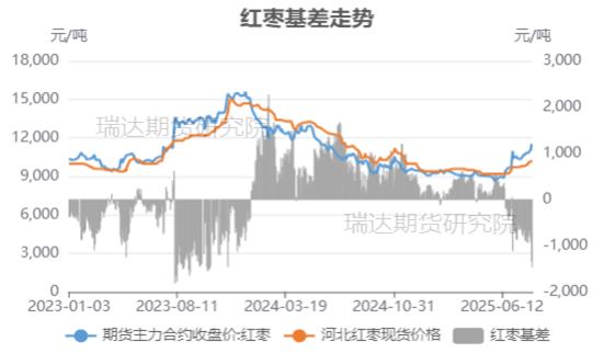 截至2025年8月11日,河北红枣现货价格为10220元/吨,红枣2601合约收盘价为11685元/吨,基差为-1465元/吨,基差率为-12.53%,造成这种期现价差表现的原因是什么,本文将做分析。