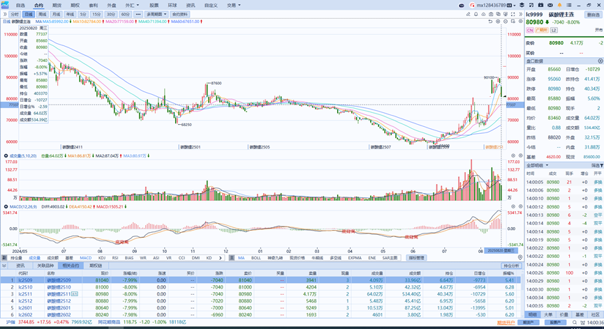 2025年8月20日,广期所碳酸锂期货主力合约快速跌停,截至收盘,LC2511合约报收80980元/吨,跌幅8%。