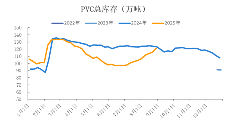 据钢联数据,截至8月29日,PVC总库存在120.84万吨,较7月底+16.15%。其中,厂内企业库存在31.21万吨,较7月底-12.58%;社会库存在89.63%,较7月底+31.15%。